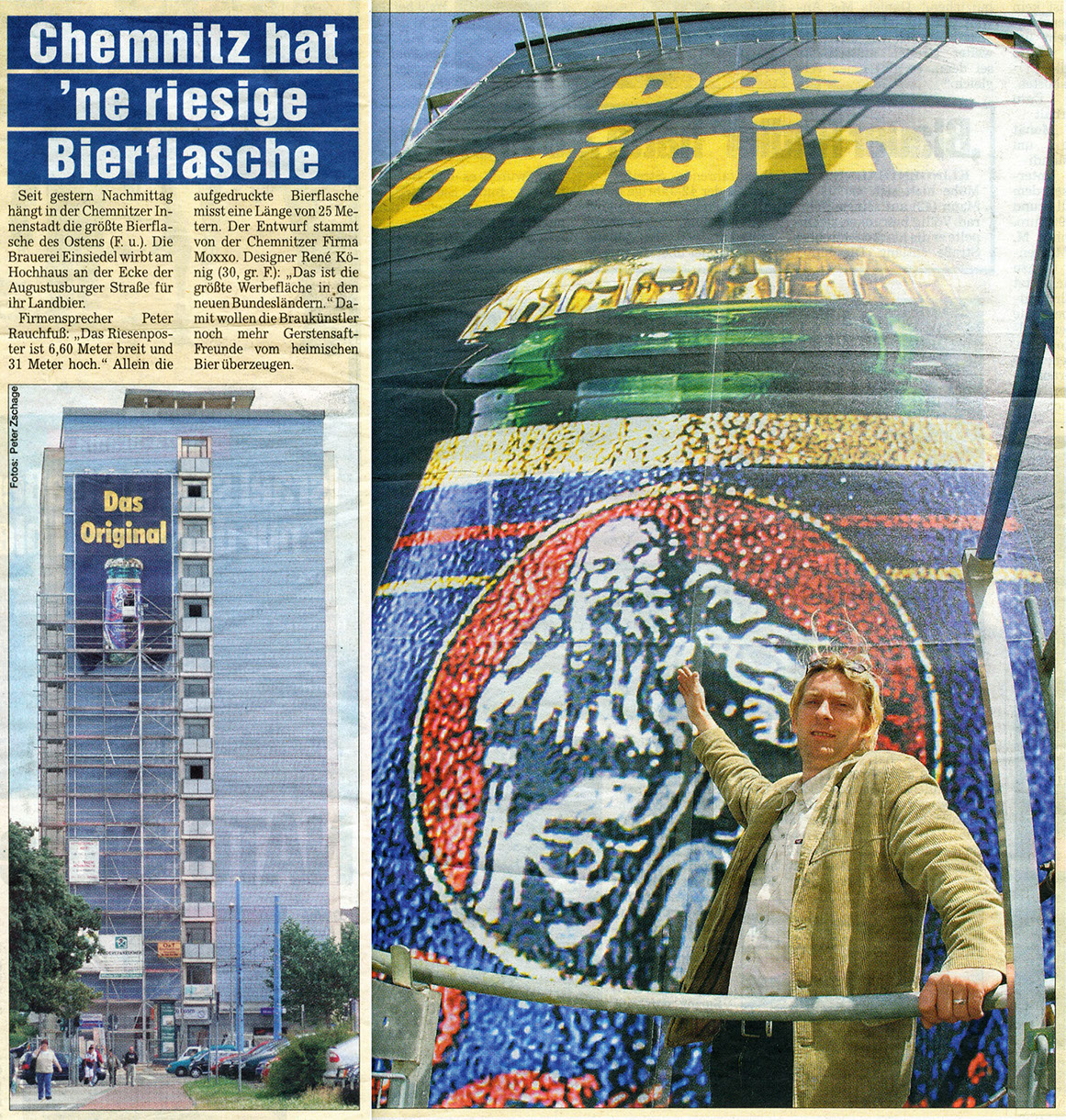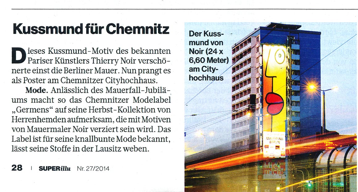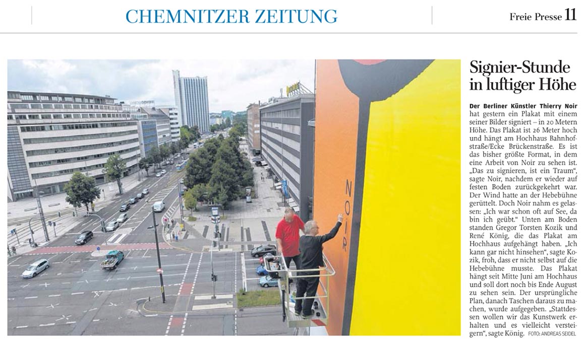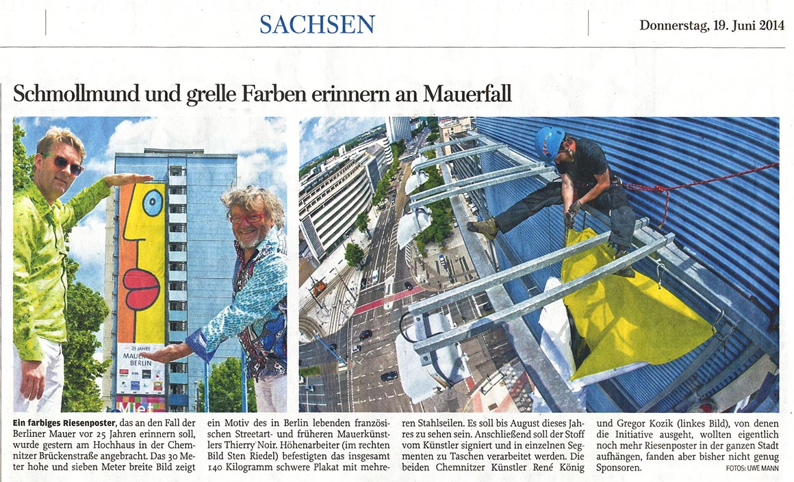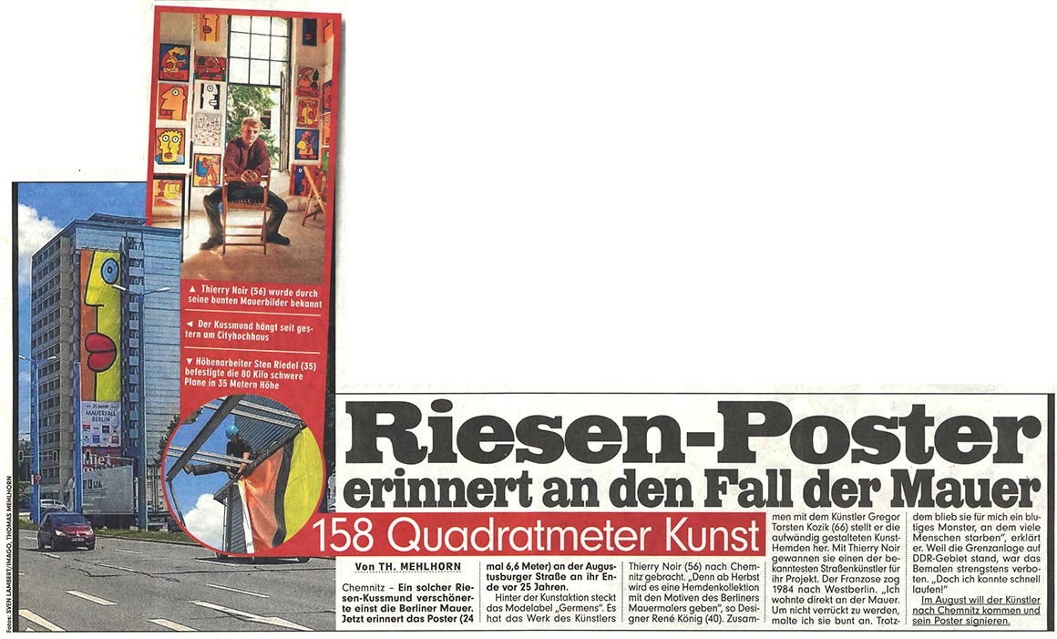 Dieser kurze TV-Ausschnitt (0:35 min) des Senders mdr Sachsenspiegel zeigt die Kunstaktion mit dem Berliner Künstler Thierry Noir am Cityhochhaus Chemnitz. Die Idee stammt von René König, die größte Reproduktion des Künstlers nicht in Berlin, sondern in Chemnitz anlässlich des 25. Jahrestages zum Bau der Berliner Mauer zu realisieren. Thierry Noir zählt zu den bekanntesten Westberliner Künstlern, die die Mauer großflächig bemalt haben.