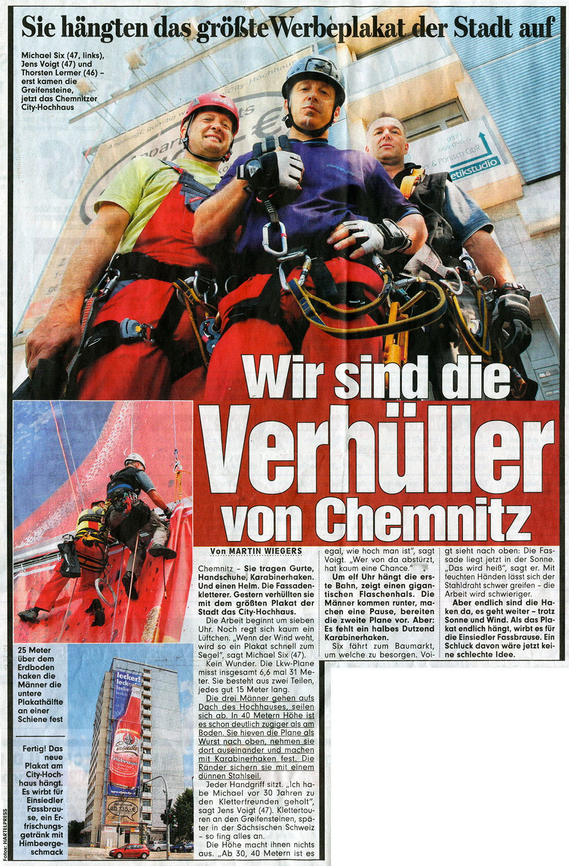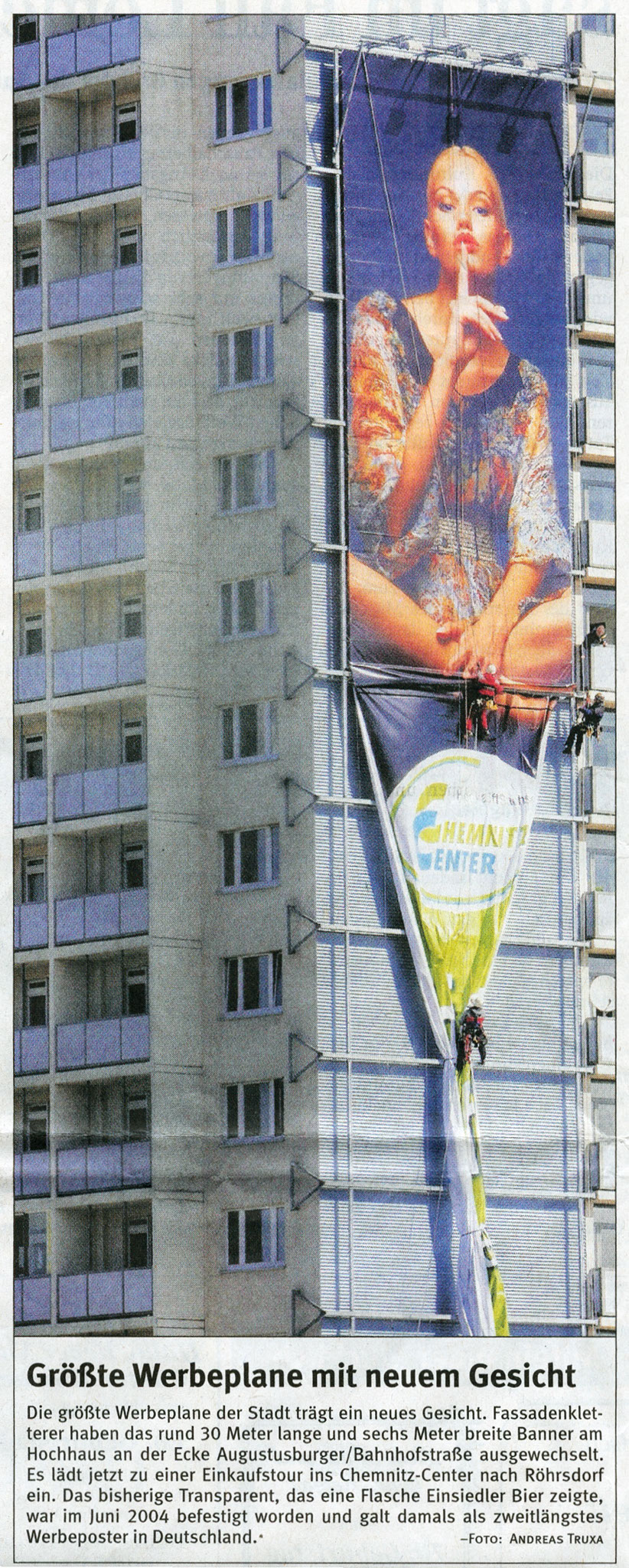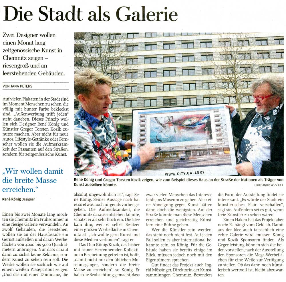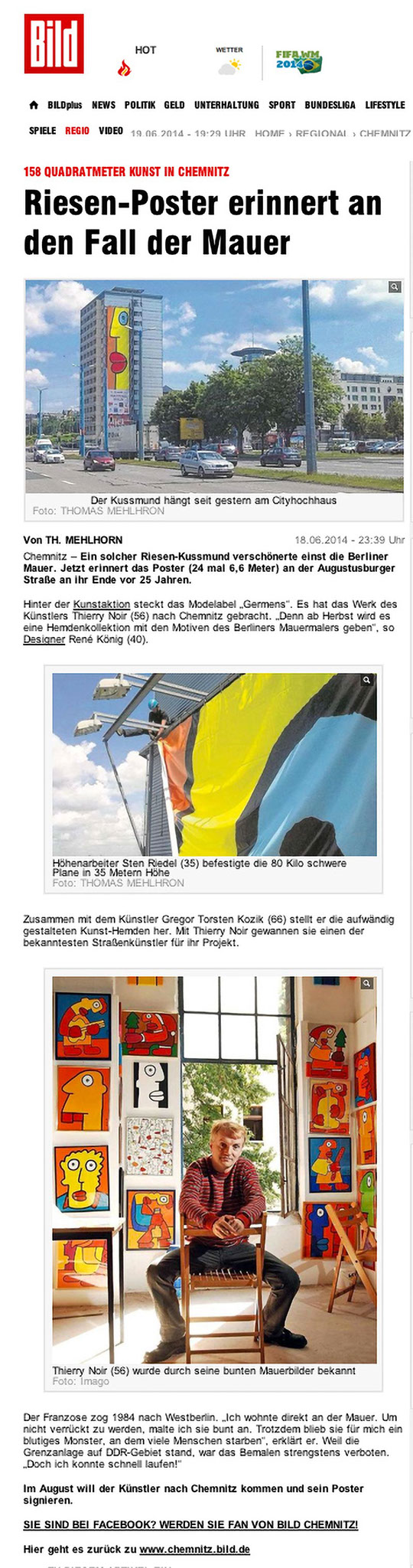 Dieser kurze TV-Ausschnitt (0:35 min) des Senders mdr Sachsenspiegel zeigt die Kunstaktion mit dem Berliner Künstler Thierry Noir am Cityhochhaus Chemnitz. Die Idee stammt von René König, die größte Reproduktion des Künstlers nicht in Berlin, sondern in Chemnitz anlässlich des 25. Jahrestages zum Bau der Berliner Mauer zu realisieren. Thierry Noir zählt zu den bekanntesten Westberliner Künstlern, die die Mauer großflächig bemalt haben.